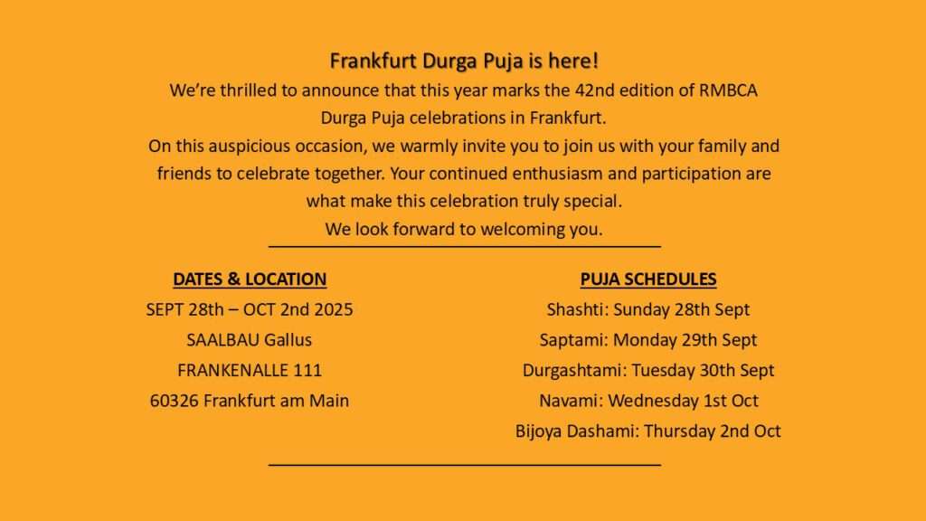 শারদীয় দুর্গোৎসব উদযাপনে আমাদের সাথে যোগ দেওয়ার জন্য আমরা আপনাদেরকে আন্তরিকভাবে আমন্ত্রণ জানাচ্ছি।