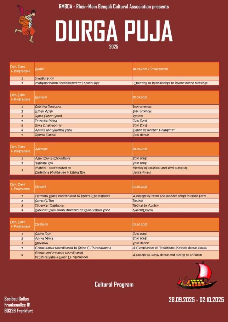 The cultural program starts at 6:30 pm. To learn more about the puja program, check out the Durgapuja schedule.